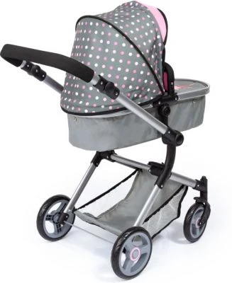 Der Kombi-Puppenwagen „Vario“ von BAYER unterstützt alle Puppeneltern mit umfangreichen Tools. Ein höhenverstellbarer Griff lässt sich optimal an die Kindergröße anpassen. Die Wanne des Wagens kann sowohl in als auch gegen die Fahrtrichtung aufgesteckt werden und auch der Griff lässt sich so justieren. Für noch mehr Variation beim Spaziergang sind nur ein paar Handgriffe nötig und schon wird aus dem Puppenwagen ein echter Sportwagen. Bei der großen Auswahl an Farben und Muster ist für jeden Geschmack etwas dabei und der Ausflug kann losgehen.