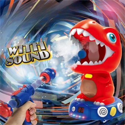 Dinosaurier-Ziel 39 x 15 x 25 cm, Schießpistole 12,5 x 5 x 33 cm, Wasserpfeife 6,2 x 1,6 cm, weiche Kugel 2,2 cm. Produktverpackungsgröße: 26 x 16 x 19 cm.