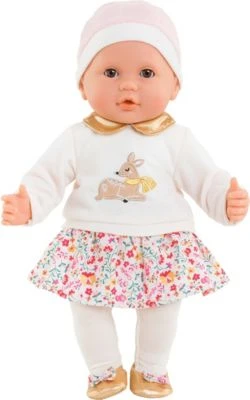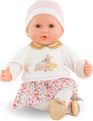 Diese bezaubernde Weichkörperpuppe von Corolle ist genau das richtige Geschenk für kleine Puppeneltern! Die niedliche Puppe mit Schlafaugen kann sitzen, am Daumen lutschen und hat einen besonderen Vanilleduft. Zudem trägt die Puppe ein schönes Outift, dass aus einem Pullover mit Rehmotiv und goldenem Kragen, einer Mütze, einem Blümchenrock, einer Strumpfhose und passenden Schühchen besteht.