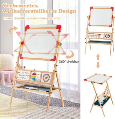 Entworfen mit einem doppelseitigen Zeichenbrett, das um 360° gedreht werden kann, besteht diese Kunststaffelei aus Holz aus einer Tafel und einem magnetischen Whiteboard. Außerdem schafft die Papierrolle zusätzliche Fläche zum Zeichnen und Schreiben.