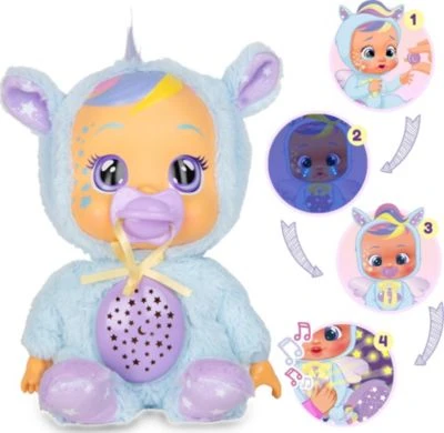 Hier kommt Jenna! Mit der Cry Babies „Schlaf schön Jenna“ von IMC Toys kommt eine kuschelweiche Spielebegleitung für den Tag und eine bezaubernde Einschlafhilfe für die Nacht. Wie die anderen Cry Babies weint auch Jenna Tränen, sobald man ihr den Schnuller wegnimmt. Aber Jennas Tränen leuchten im Dunklen! Und beim Druck auf ihr Puppenbäuchlein erscheint ein großer Sternenhimmel mit Mond an der Kinderzimmerdecke. Das Sternenbild leuchtet circa 11 Minuten lang und kann von 5 liebevollen Melodien, die sich jeweils für 30 – 45 Sekunden abspielen lassen, begleitet werden. Jenna hat aber auch 8 verschiedene Baby-Laute im Gepäck und ist im superweichen Schlafanzug einfach zum Liebhaben!