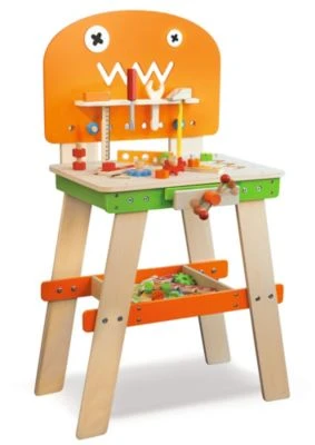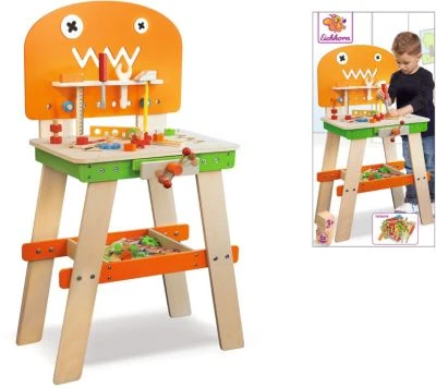 In der 40-eiligen Werkbank von Eichhorn findet alles seinen Platz! Dazu gehören die Säge, der Schraubstock, der Schraubenschlüssel und viel weiteres Zubehör wie Schrauben, Muttern und Verbindungselemente. Im unteren Ablagefach kann man diese Kleinteile gut zu verstauen.