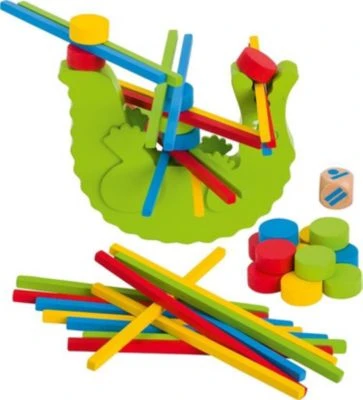 Bei dem Stapel- und Balancier-spiel „Krokodil“ von goki zeigt der Würfel an, was als nächstes auf den Stapel kommt. Sobald die Last zu schwer wird, kippt das Krokodil und der Haufen bricht zusammen. Doch dann geht der Bau-Spaß einfach wieder von vorne los!