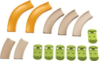 + 5 Holzkurven, 2 gelbe Kunststoffkurven, 7 grüne Verbindungsteile