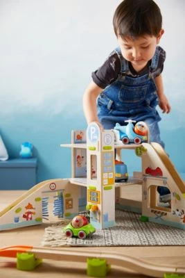 Endlos lange Parkplatzsuche? Nicht in Kullerbü, denn hier gibt es ein großes Parkhaus mit vielen Stellplätzen für die Kullerbü-Fahrzeuge. Wer mag, kann mit seinem Flitzer, Kugel-Cabrio oder Einsatzfahrzeug vor oder nach dem Parken schnell noch einen Abstecher durch die integrierte Waschstraße im Erdgeschoss machen. Ist das Fahrzeug mal kaputt? Kein Problem, dann kommt es einfach auf die Hebebühne und wird repariert. Außerdem kann der Aufenthalt im Parkhaus auch für einen kurzen Tankstopp genutzt werden. Und das ist noch längst nicht alles: Auf dem obersten Parkdeck befindet sich ein Landeplatz für den Kullerbü-Hubschrauber.