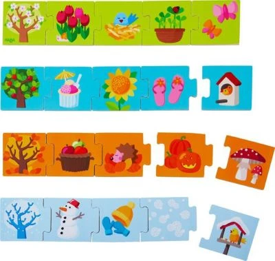 Welche Blumen blühen im Frühjahr oder Sommer? Welche Früchte kann man im Herbst ernten und was kann man im Winter draußen machen? Hier ordnen die Kinder jedem der 5 Baumplättchen die passenden Motivplättchen zu. So lernen sie spielerisch die verschiedenen Jahreszeiten kennen.