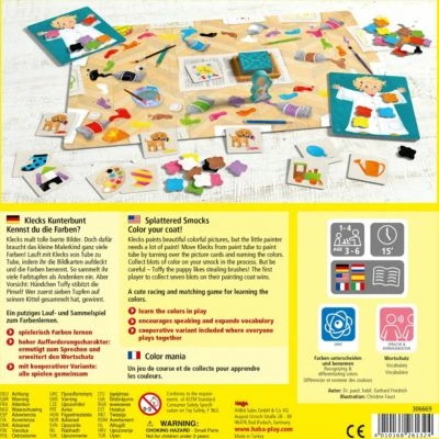 Eintauchen in die bunte und spannende Welt der Farben. In dem Spiel „Klecks Kunterbunt“ von Haba lernen Kids spielerisch die Farben kennen. Alle Mitspielenden laufen von Tube zu Tube und sammeln fleißig Farbkleckse ein. Doch vorsicht! Hund Toffy hat zwar den Hundeblick perfekt drauf, aber es auch faustdick hinter den Ohren. Immer wieder versucht er, die Pinsel zu stipitzen. Wer es zuerst schafft, sieben Kleckse zu sammeln, darf sich feierlich Gewinnner*in des Speils nennen!