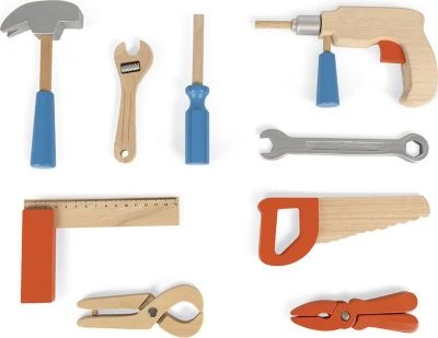 Der Koffer enthält alle notwendigen Utensilien für die zukünftigen Handwerker. Leicht zu transportieren dank seines kleinen Holzgriffs. 9 Werkzeuge. Kautschukbaumholz Druck : Aufkleber.