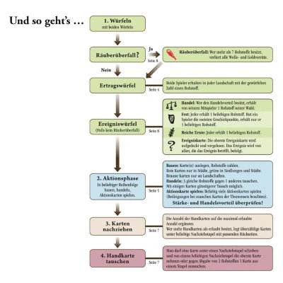Los geht es mit einem kleinen Fürstentum, das nur aus wenigen Karten besteht. Wenn die Würfel richtig fallen, bringen die Landschaften Rohstoffe ein, die klug für den Kauf neuer Karten verwendet werden sollten.