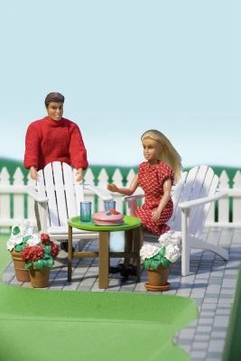 – enthält 2 Gartenstühle, einen Tisch, 2 Gläser, eine Torte und 3 Blumentöpfe