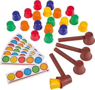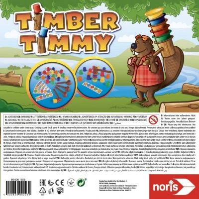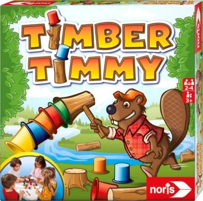 „Timber Timmy“ ist Meister im Holzscheite stapeln, wer kann ihn vom Thron stoßen?? In der Tischmitte liegen Hütchen in 5 verschiedenen Farben und jeder Spieler erhält einen Hammer. Alle Mitspieler versuchen nun mit ihrem Hammer die Hütchen nacheinander in der auf den Karten vorgegebenen Reihenfolge so schnell wie möglich aufeinander zu stapeln, um die Karte zu bekommen. Gewonnen hat das rasante Stapelspiel derjenige, der als erster 5 Karten gesammelt hat