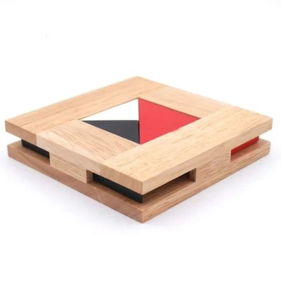 Dr. Volker Latussek hat ein „Haus“ entwickelt, indem die 7 Spielsteine des bekannten Tangramspieles eingepuzzelt werden müssen. Drei Spielsteine liegen in der Startposition in einem Ausschnitt über den anderen Spielsteinen. Alle 7 Teile müssen jetzt in den Zwischenraum, das Haus, gepuzzelt werden. Nur eine Lösung ist möglich. Selbstverständlich kann das Tangram auch als traditionelles Spiel genutzt werden. Dazu müssen die 7 verschiedene Holzteile müssen in einer Ebene zu zweidimensionalen Figuren ausgelegt werden. Sie dürfen weder hochkant gestellt werden noch sich ganz oder teilweise überlagern. Die 7 Spielsteine sind farbig gebeizt in den drei Farben Weiß, Rot und Schwarz. Dadurch ergeben sich in den Legebildern schöne Farbkombinationen.