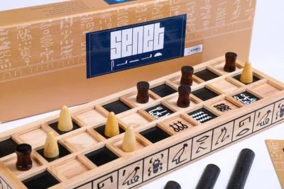 SENET ist ein alt-ägyptisches Spiel, von dem 4 Exemplare im Grabe des Tutanchamon gefunden wurden. Es war ein königliches Spiel. Die Spielregeln sind nicht überliefert, sondern rekonstruiert worden. Es ist ein taktisches Spiel. Es wird mit Stäbchen statt mit Würfelsteinen gespielt. Das Spiel wird von 2 Spielern gespielt und dauert etwa eine Viertelstunde. Das Spielfeld ist in drei Reihen a´ 10 Felder eingeteilt. In einer Schublade des Spieles werden die 5 naturfarbene und 5 grüne Holzspielsteine sowie die 4 halbrunden Holzstäben (sind die Würfel) auf bewahrt. Ziel des Spieles ist es, als erster mit all seinen Figuren die 30 Felder überwunden zu haben. Dabei kann der Gegner geschlagen werden oder man muss unter bestimmten Spielvoraussetzungen rückwärts ziehen. 5 von den 30 Feldern tragen unterschiedliche alte ägyptische Symbole, die den Spielern ein Durchkommen erschweren.