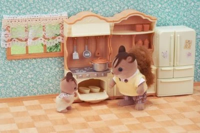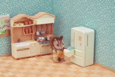 Die Sylvanian Families Landhaus Küche mit Kühlschrank darf in keinem Puppenhaus fehlen. Die beiden Schränke können als Küchenzeile nebeneinander aufgebaut werden. Auf dem Herd und im Backofen zaubern die Puppenfamilien die leckersten Gerichte. Im Kühlschrank findet man alles was man zum Kochen braucht. Nach dem Essen wird in der Spüle alles Geschirr sauber gespült und in den Regalen verstaut.